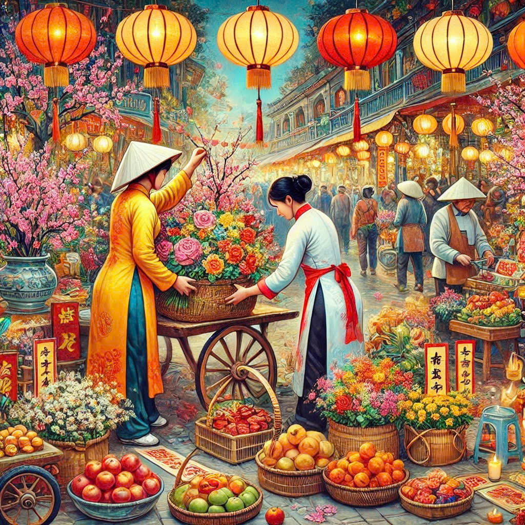 Bán hàng Tết: Các sạp chợ đông đúc với người bán và người mua. Những gian hàng đầy ắp bánh kẹo, mứt, trái cây, hoa tươi, và đặc biệt là đào, mai, quất được bày bán khắp nơi .Gói bánh chưng, bánh tét: Nhiều gia đình quây quần bên nhau, gói bánh chưng, bánh tét. Nồi bánh sôi lục bục bên bếp lửa tạo nên không khí đầm ấm và còn nhiều hoạt động nhộn nhịn khác click vào để tìm hiểu thêm nhé